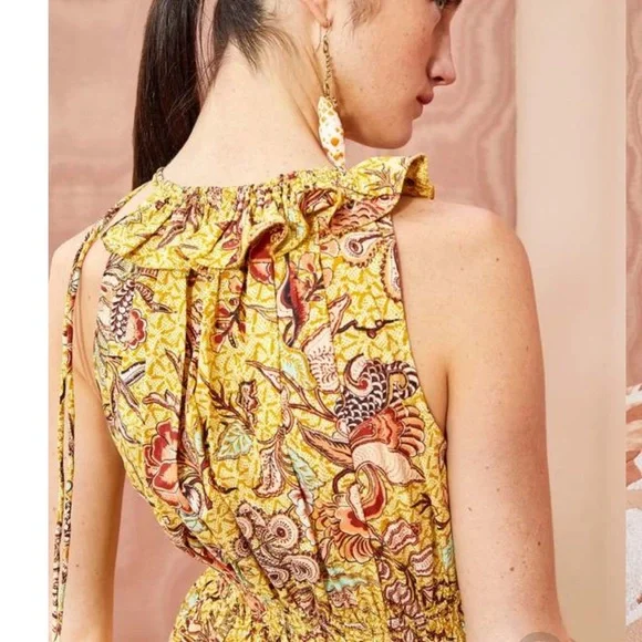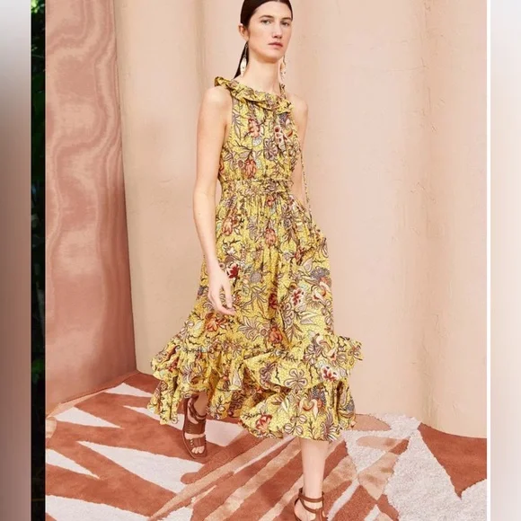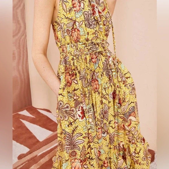 Great condition Delfina Dress is made from a wild hibiscus printed poplin in yellow and red hues. This silhouette introduces this season's new asymmetrical neckline, featuring a one-shoulder ruffle sleeve paired with a delicate drawstring tie on the opposite side. The extra-long drawstring detail is completed with functional button loops, allowing the strings to lay flat in the front or the back as is shown. Finished with an elastic waist, pockets, and double-tiered ruffle hem.Composition: 100% Cotton